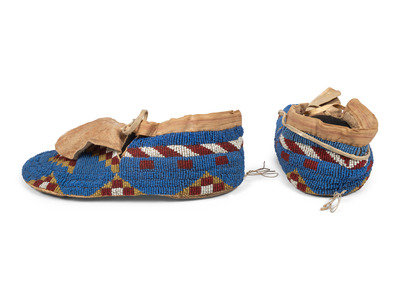 thread-sewn moccasins, beaded using colors of red, white, greasy yellow, and pony trader blue; cuffs finished with canvas