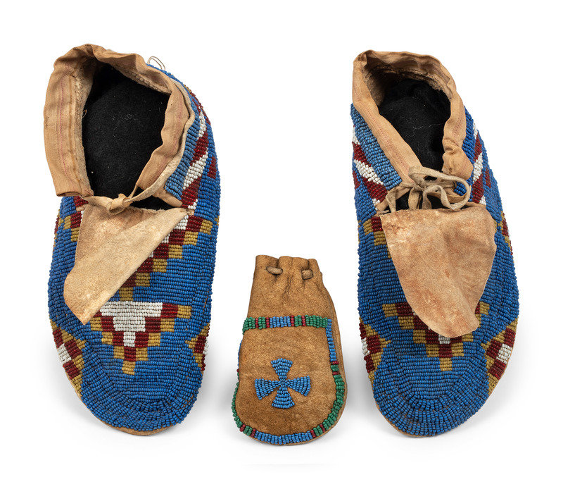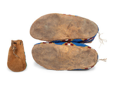 Assiniboine Beaded Hide Moccasins AND Beaded Hide Pouch