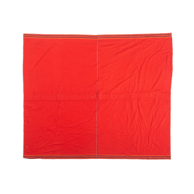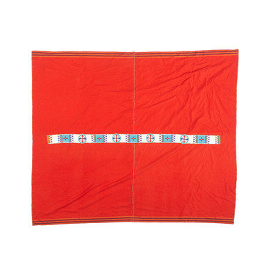 thread-sewn commercially tanned hide strip, beaded using colors of white, red, yellow, and shades of blue; mounted on red trade wool blanket