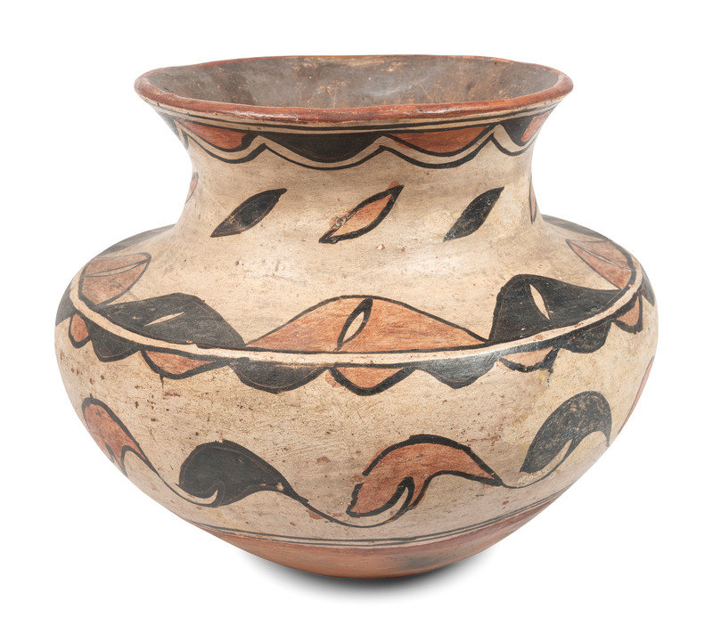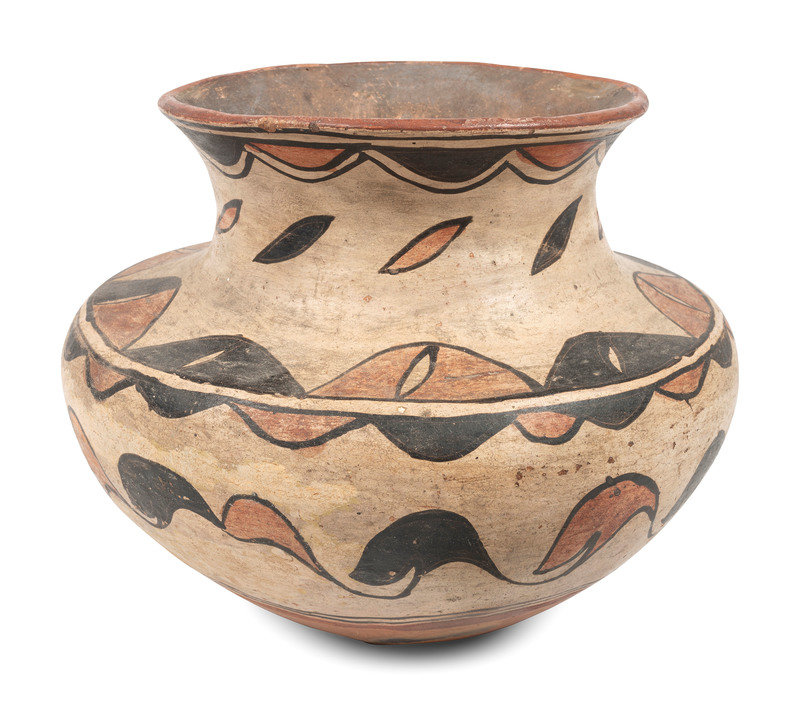 having a sharp and flat shoulder; painted with undulating bands alternating in black and red