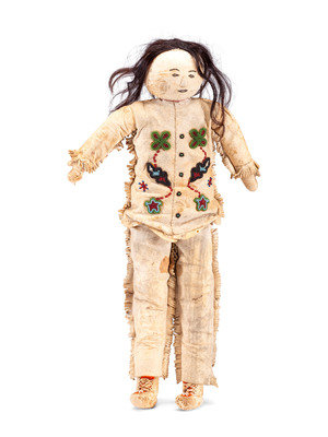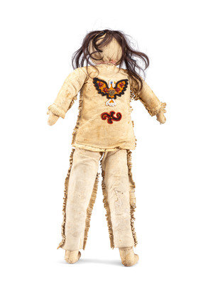 constructed on a cloth base; doll has hide face, jacket, pants, and moccasins; thread-sewn and beaded with floral and thunderbird designs