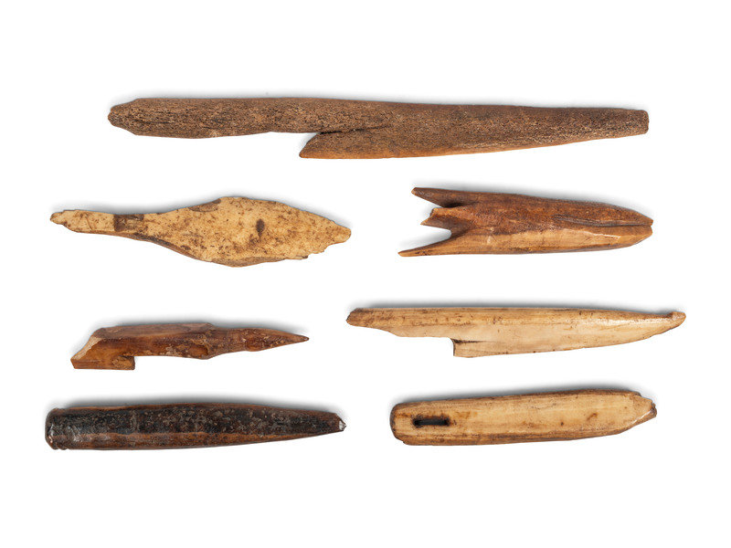a variety of tools and implements including harpoon hooks, points, and more