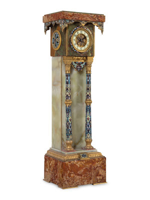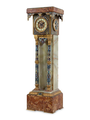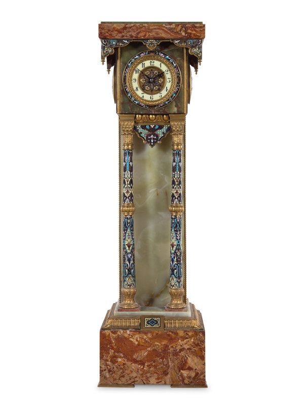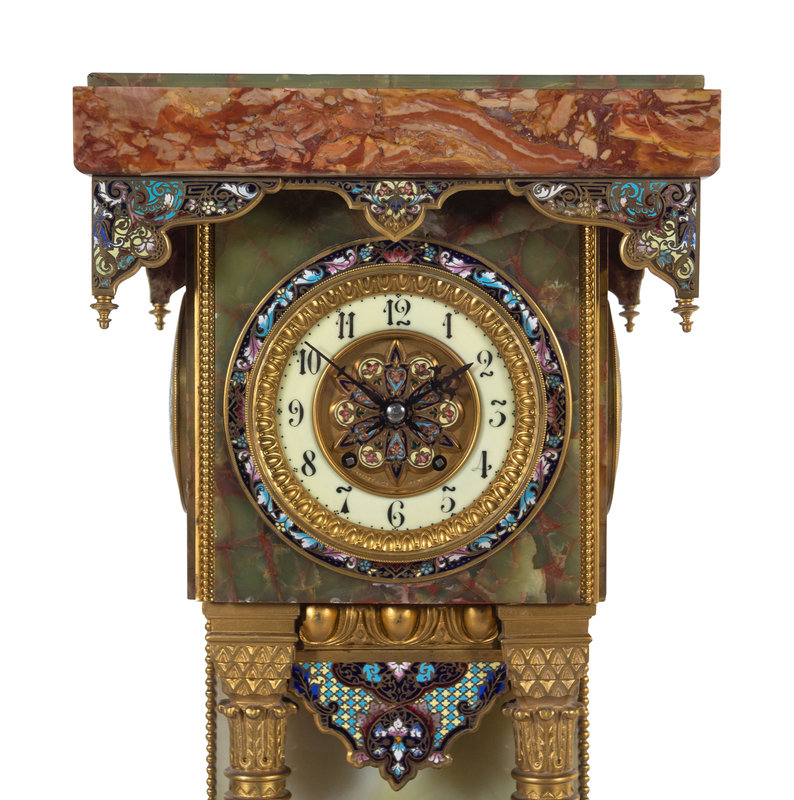 A French Green Onyx, Champlevé Enamel and Marble Pedestal Clock