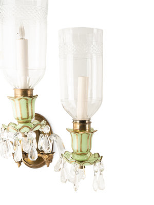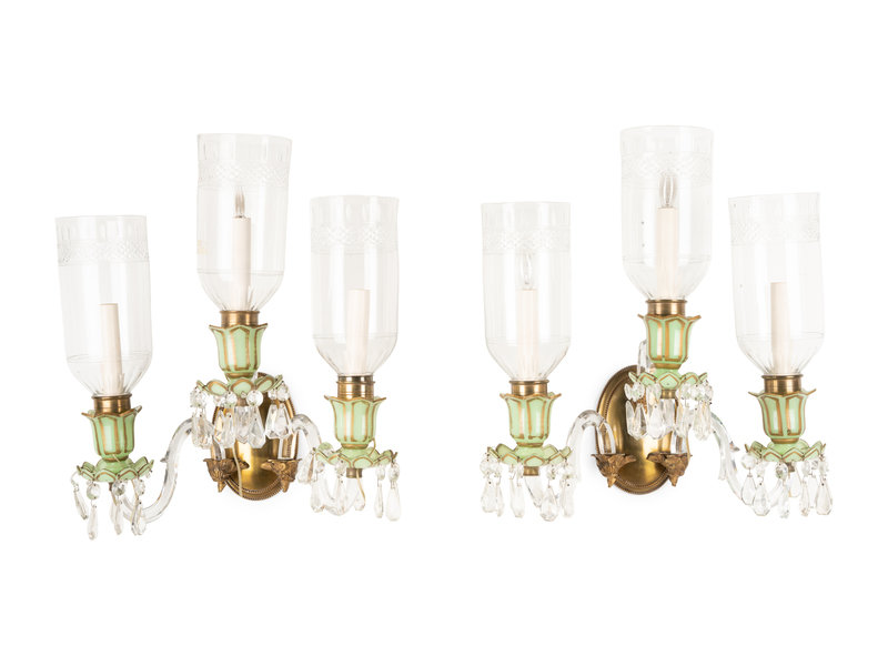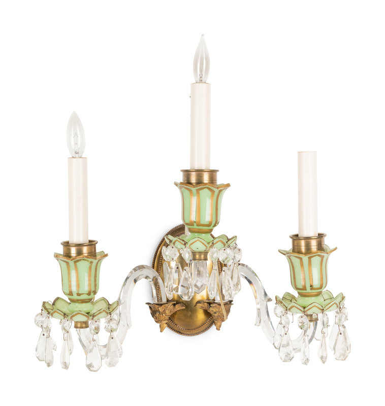 each having a bronze backplate with cased glass arms, light-green opaline cups with gilt decoration and hanging prisms.