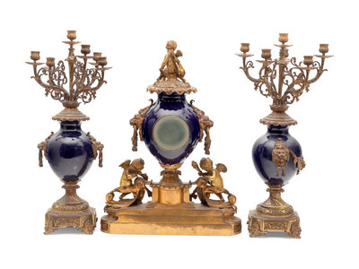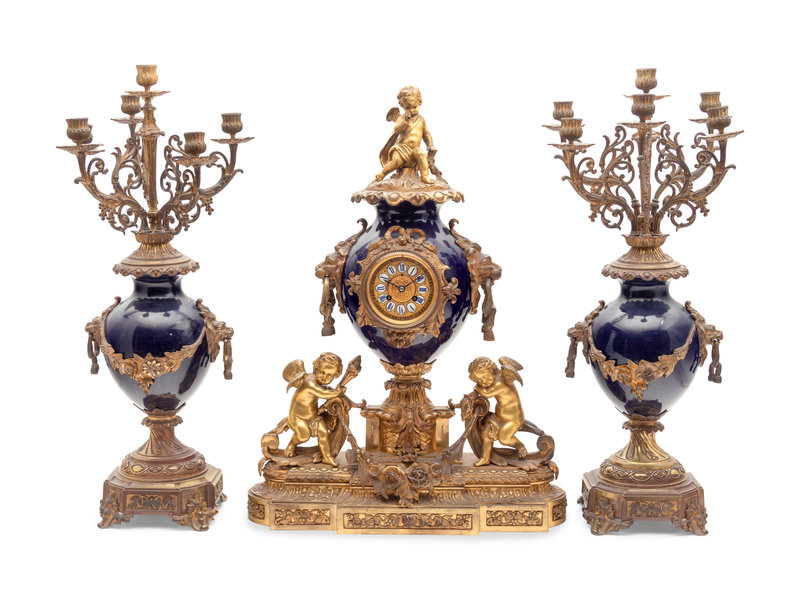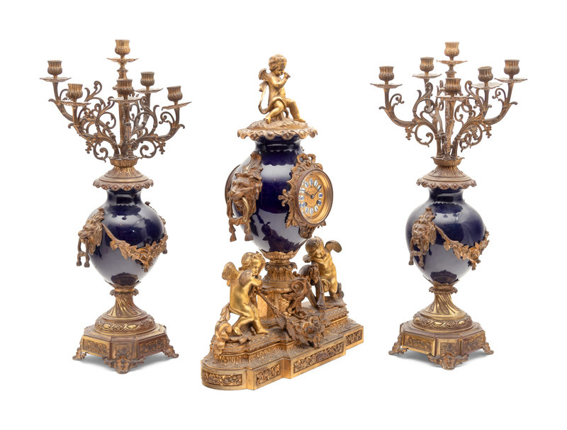 comprising a mantel clock and a pair of six-light candelabra, the movement marked H&F Paris/ 263.
