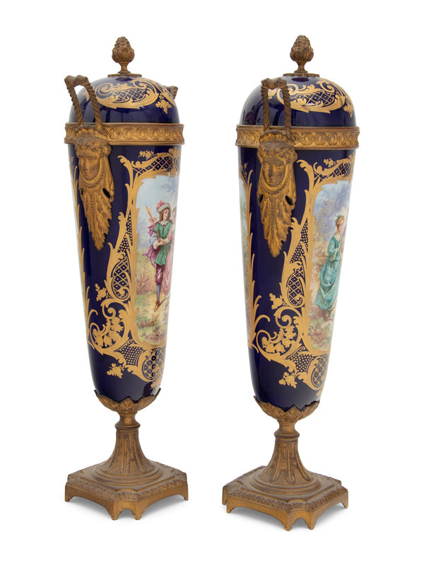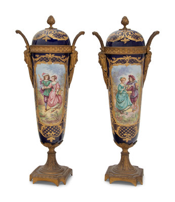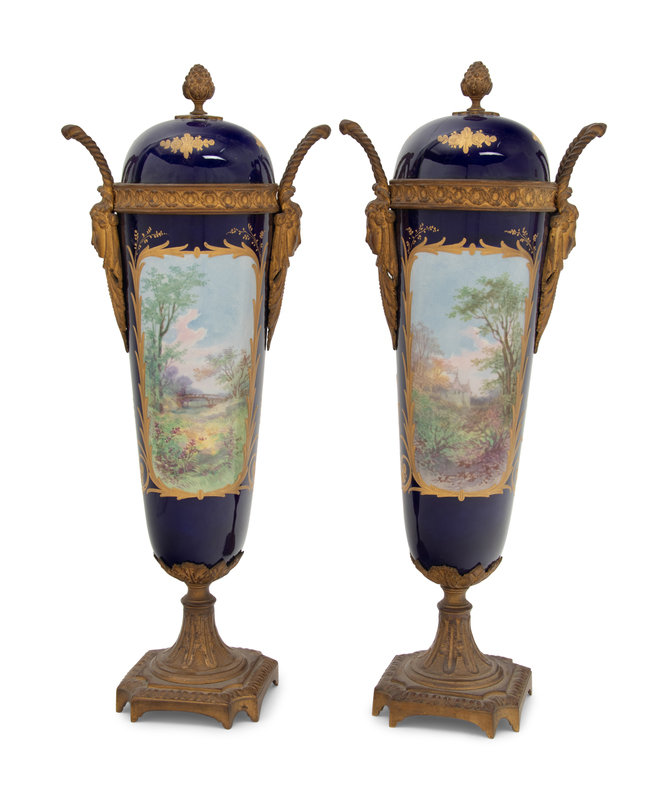 A Pair of Sèvres Style Gilt Bronze Mounted Porcelain Urns