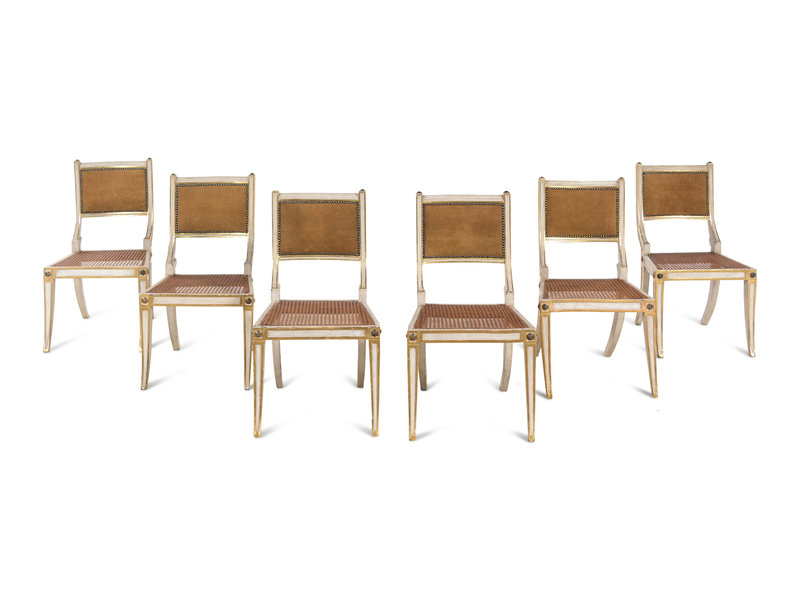 A Set of Six Continental Painted and Parcel Gilt Klismos Dining Chairs