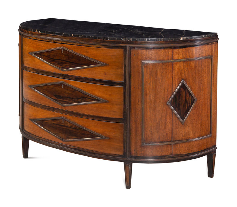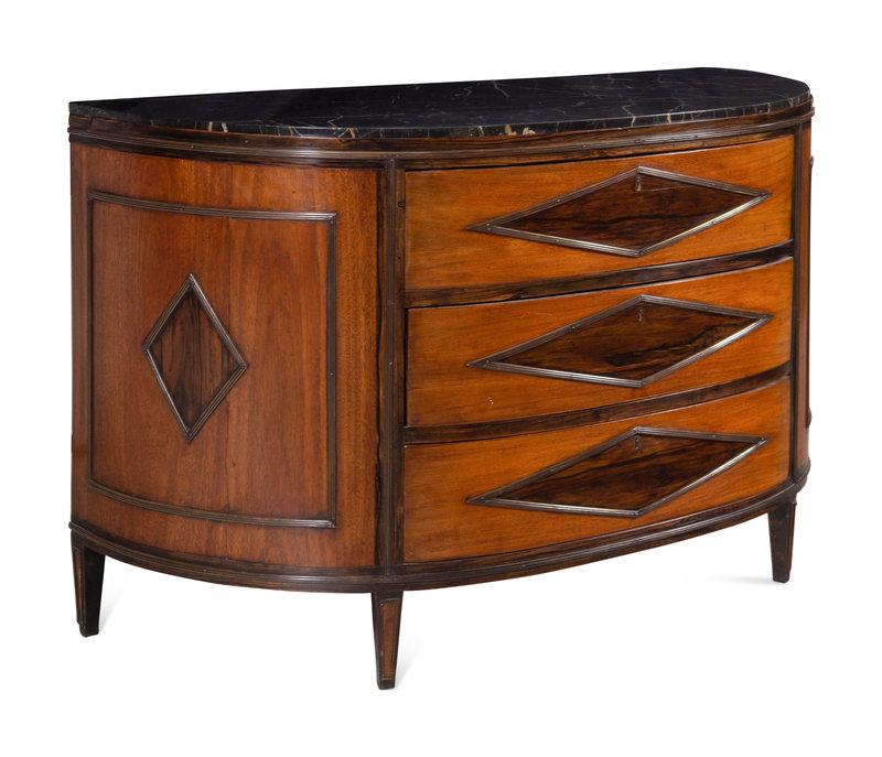 A Continental Mahogany Marble-Top Demilune Commode