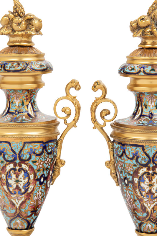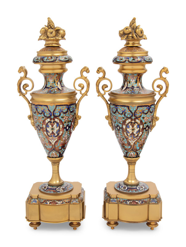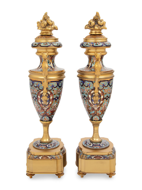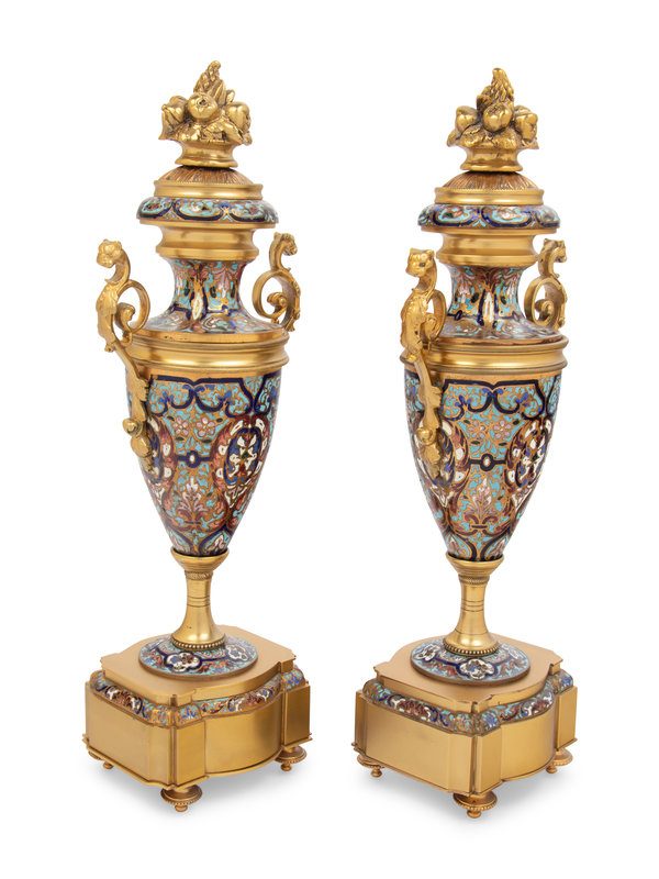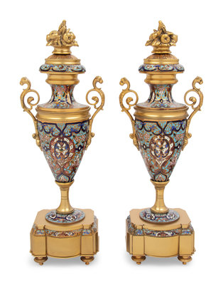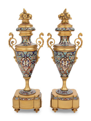 A Pair of French Gilt Bronze and Champlevé Enamel Urns