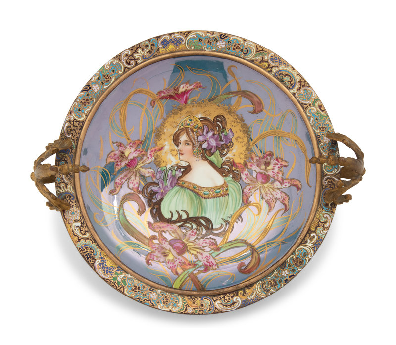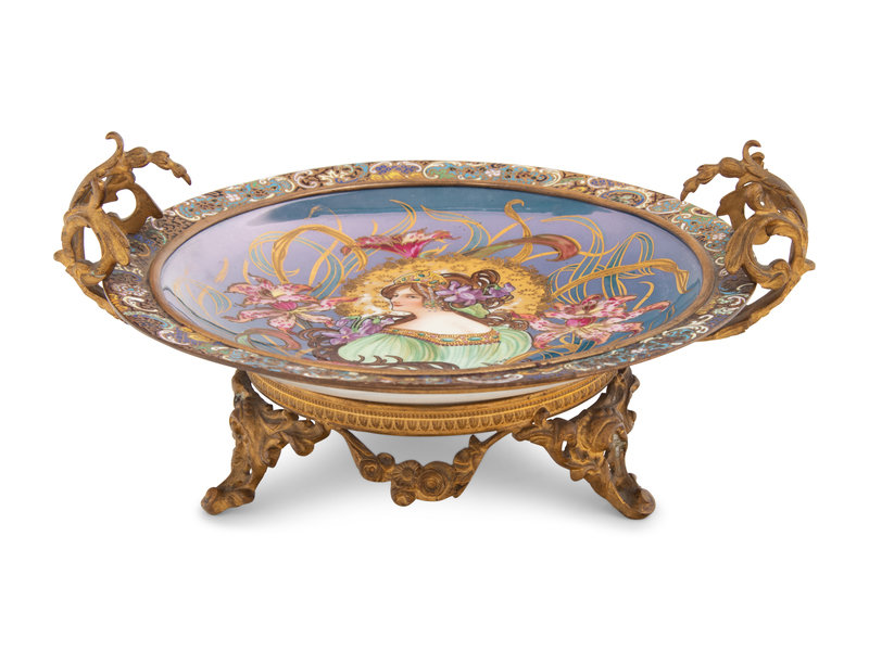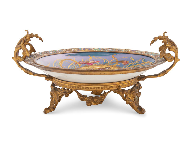A Champlevé Enamel and Gilt Bronze Mounted Sèvres Style Porcelain Plate