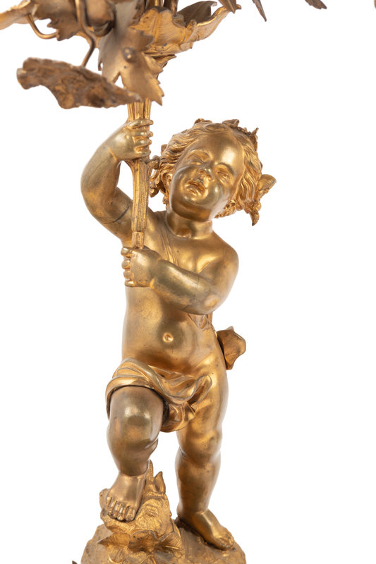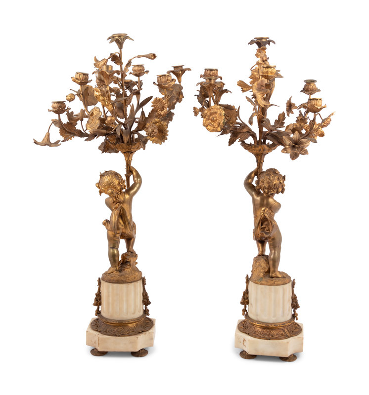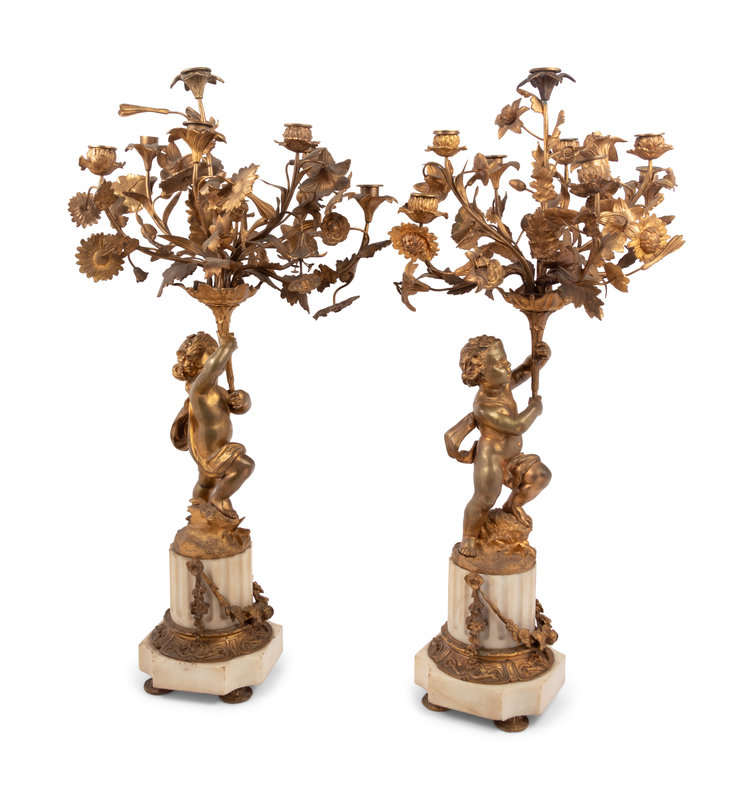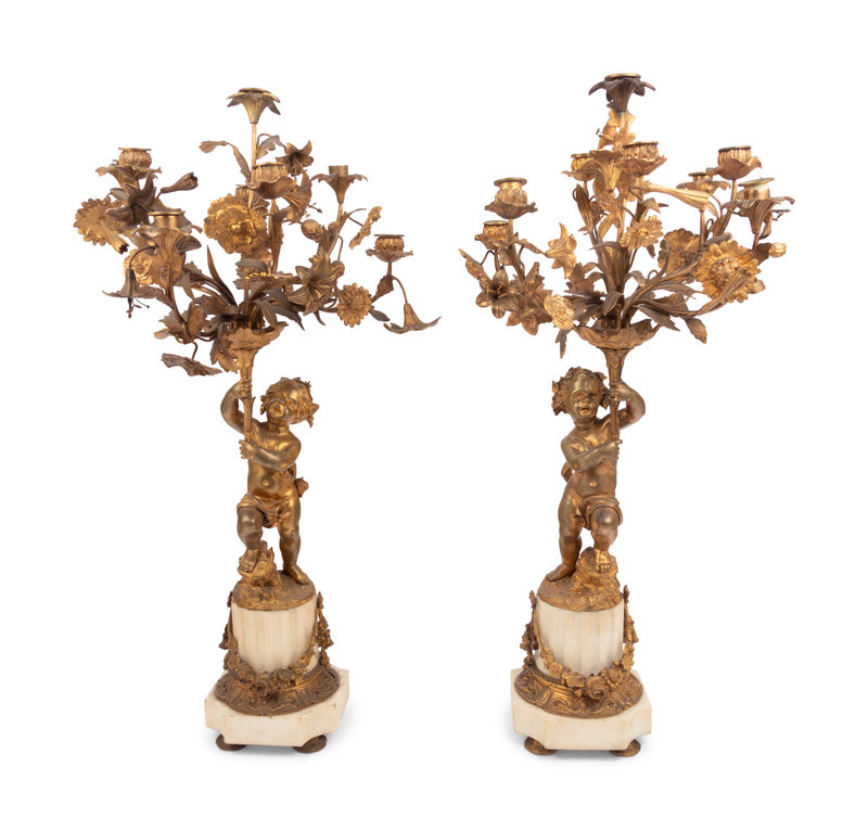 A Pair of French Gilt Bronze and Marble Figural Eight-Light Candelabra