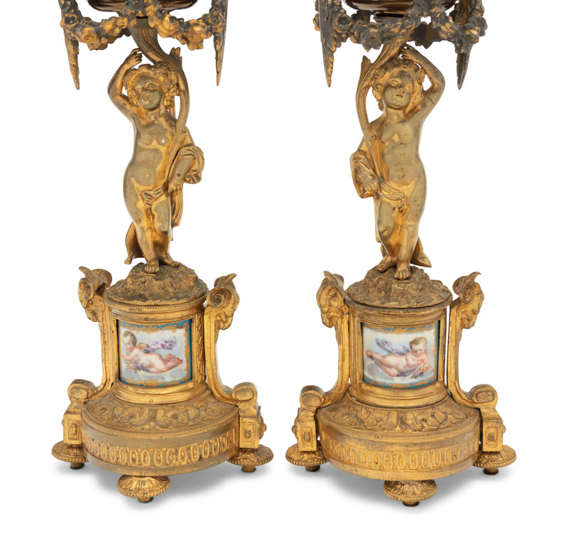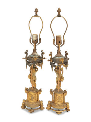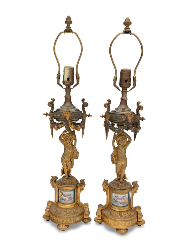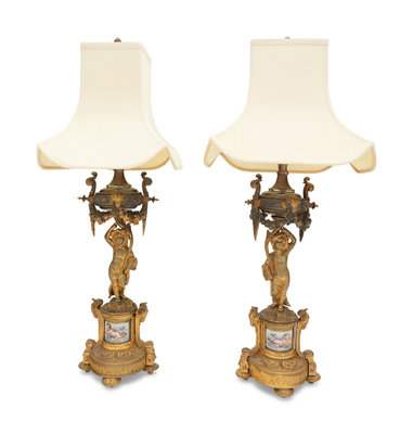 A Pair of French Porcelain Mounted Gilt Bronze Figural Lamps