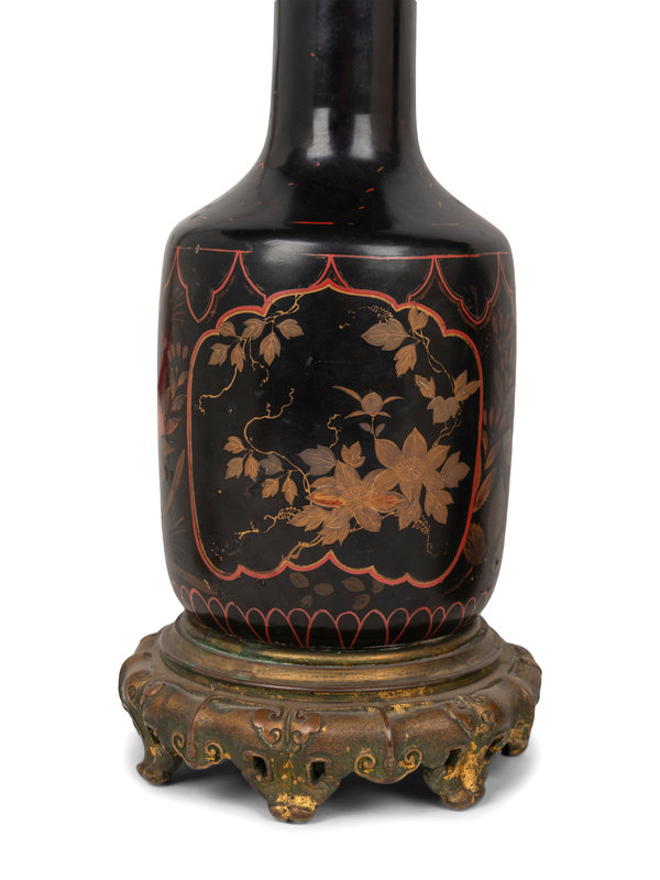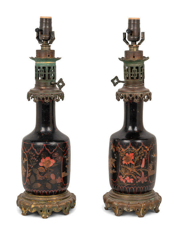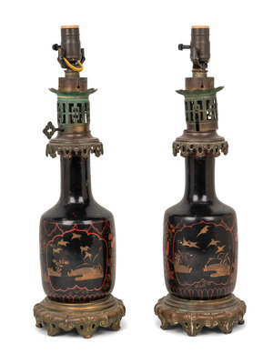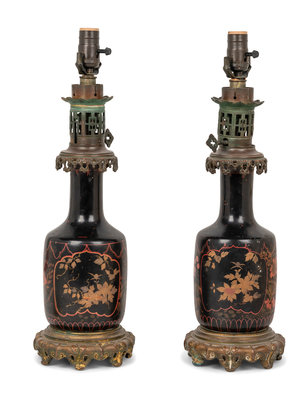 A Pair of French Gilt Bronze Mounted and Gilt Decorated Black Opaline Glass Oil Lamps