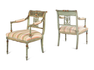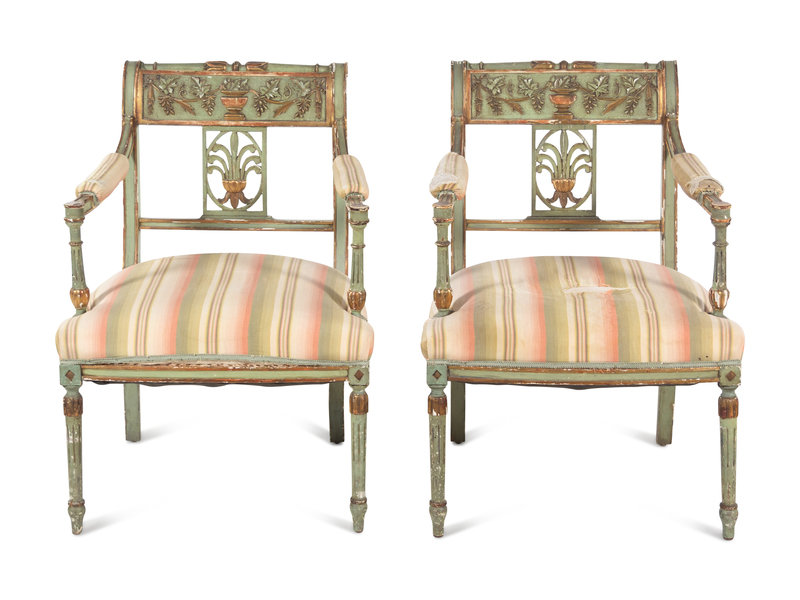 A Pair of Neoclassical Painted and Parcel Gilt Armchairs