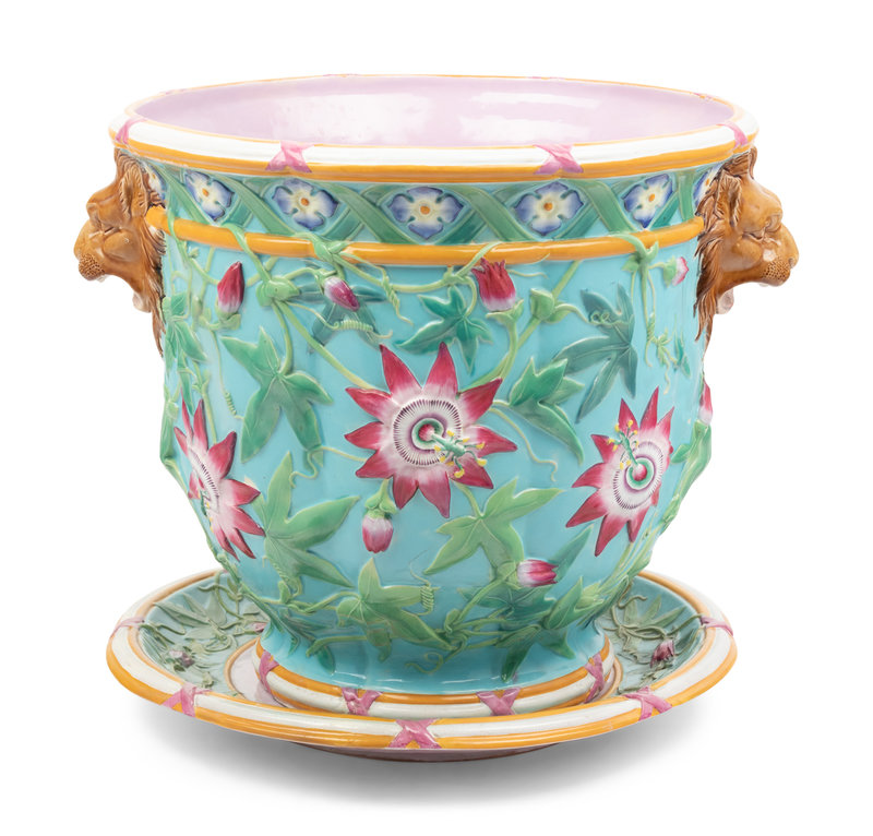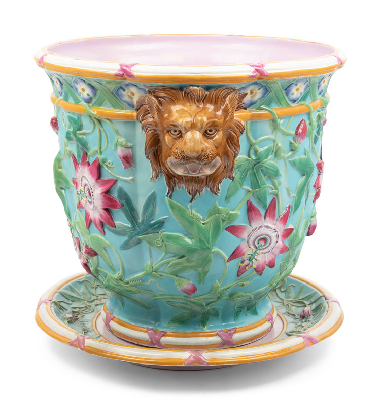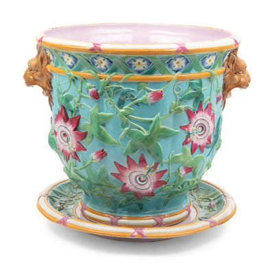 Height of jardinière 16 inches; diameter of underplate 17 3/8 inches.