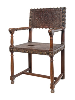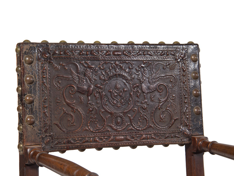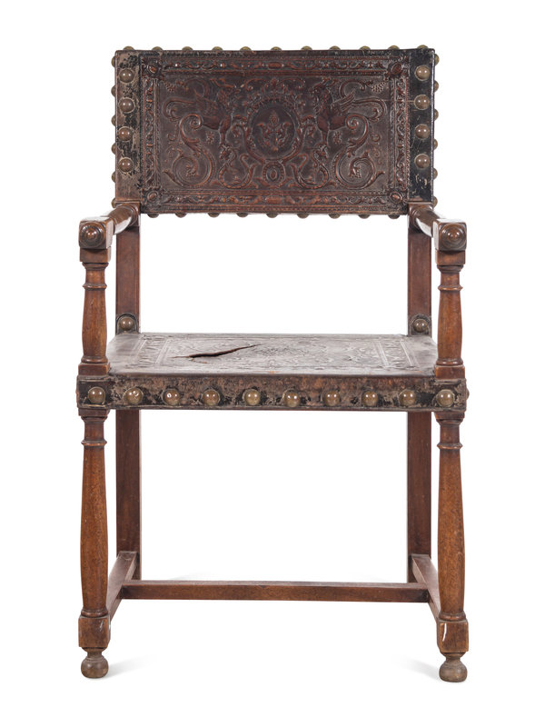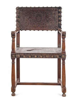 A Spanish Baroque Leather-Upholstered Walnut Armchair