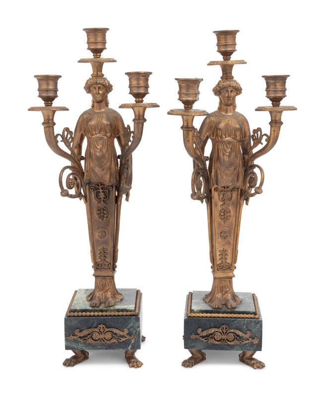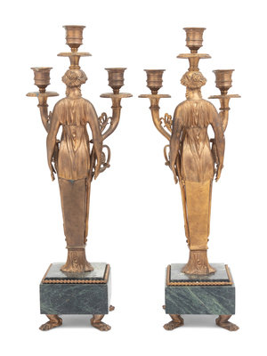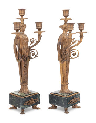 A Pair of Gilt Bronze and Marble Figural Three-Light Candelabra