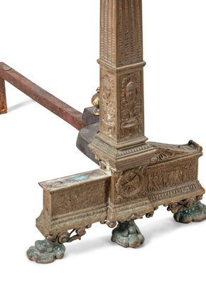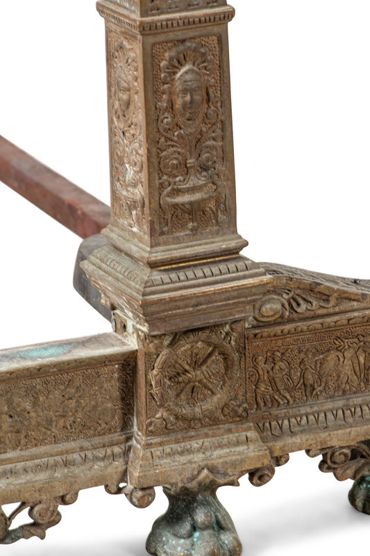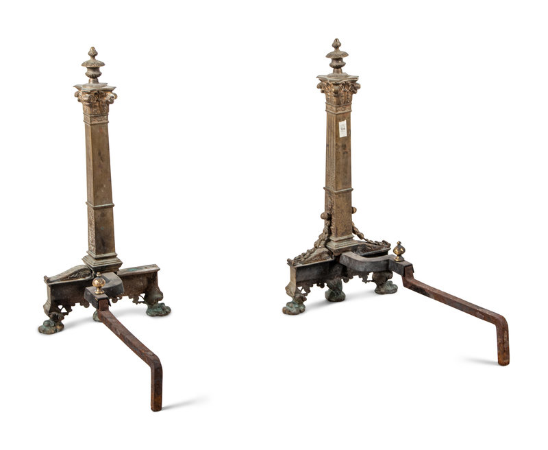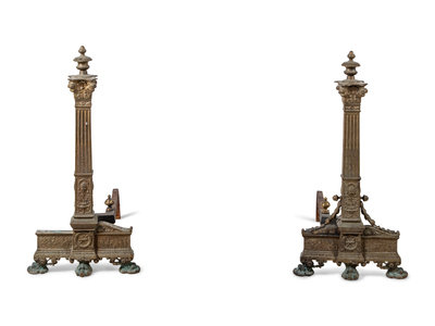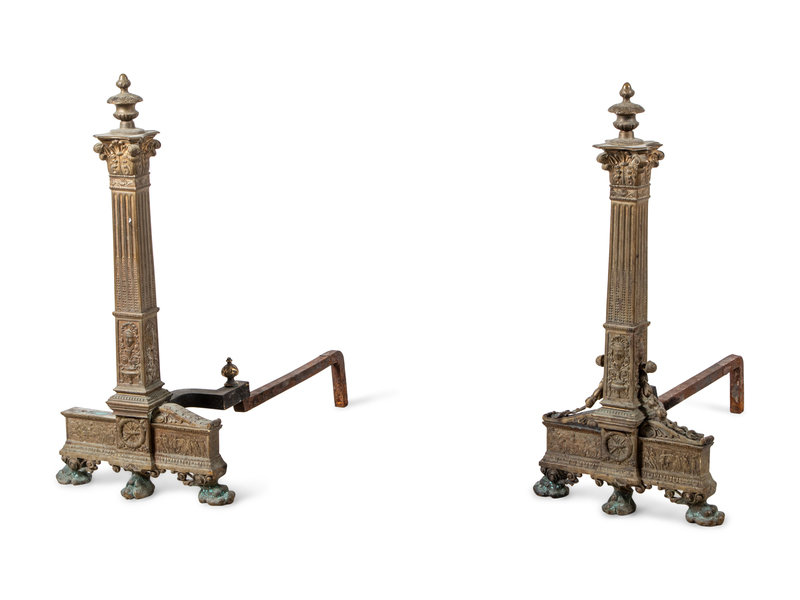 A Pair of Continental Gilt Bronze Andirons with Corinthian Columnar Capitals