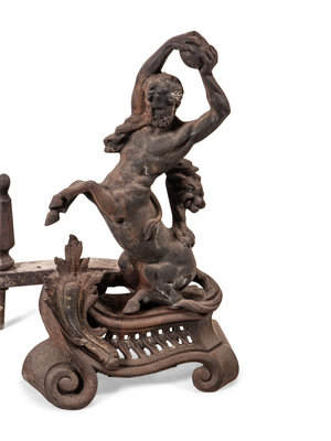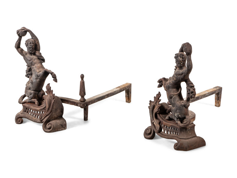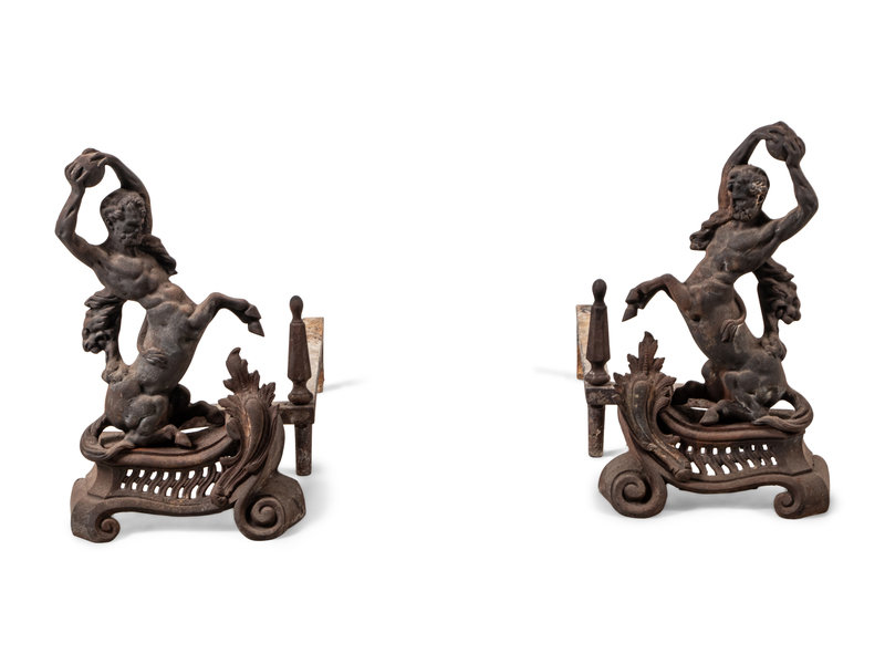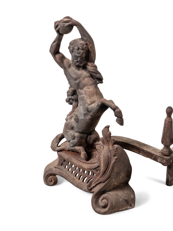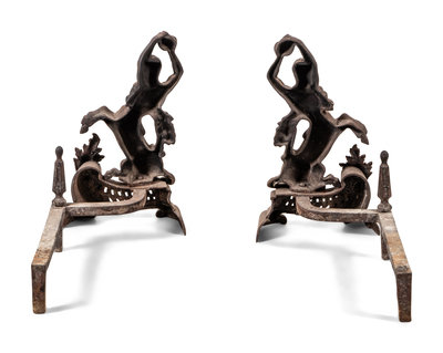 A Pair of Continental Iron Andirons with Hercules and the Nemean Lion