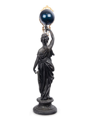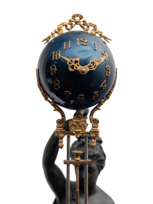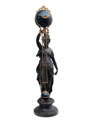 A Continental Cast Metal and Enameled Figural Pendulum Clock