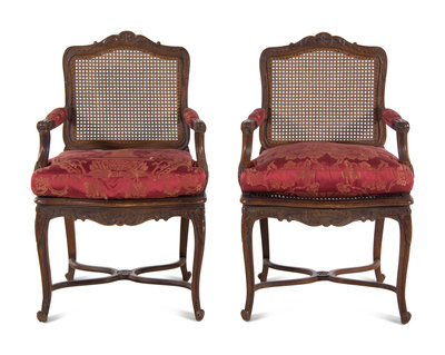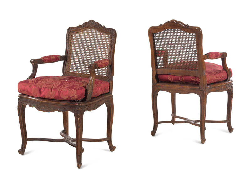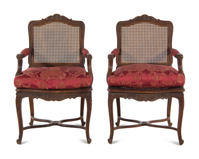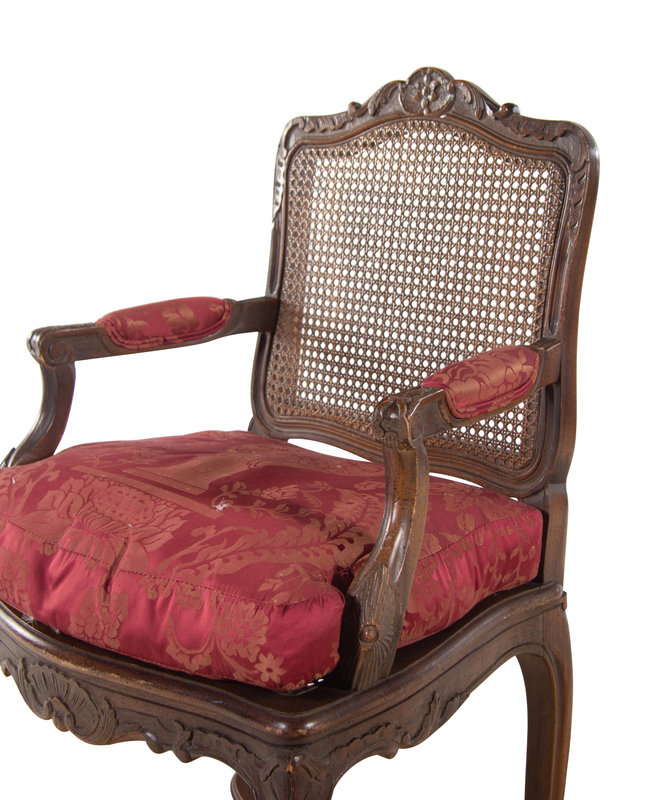 A Pair of Louis XV Style Fauteuils with Red Damask Armrests and Seat Cushions
