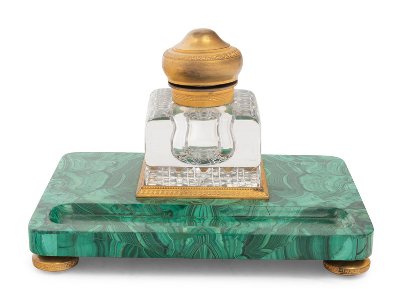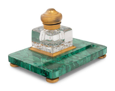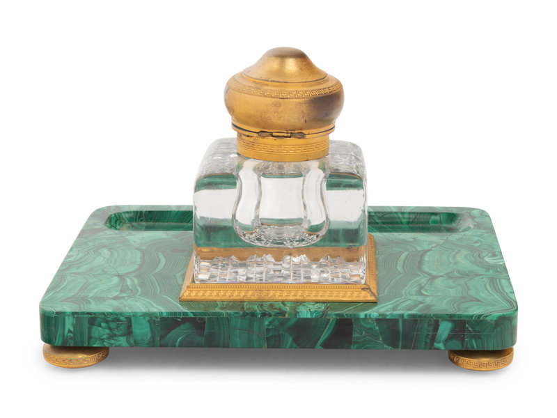 A Continental Gilt Bronze Mounted Malachite Veneered Inkstand