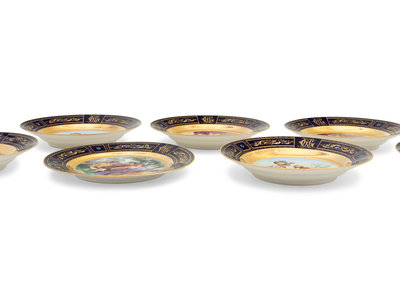 comprising six bowls and one plate, each decorated with mythological or classical scenes and bearing beehive marks in underglaze blue to the underside.