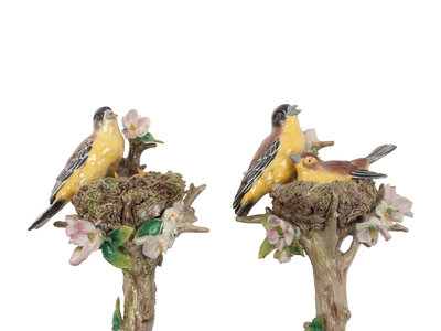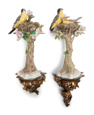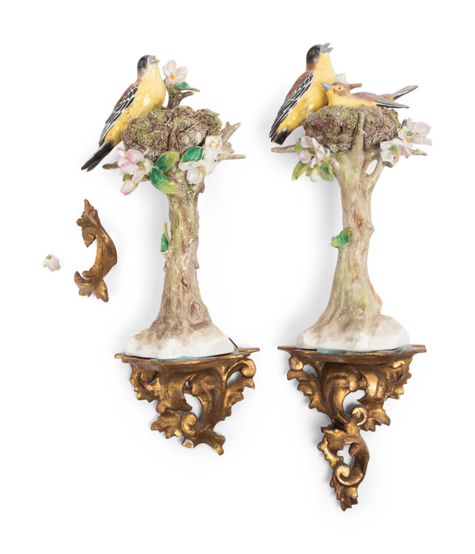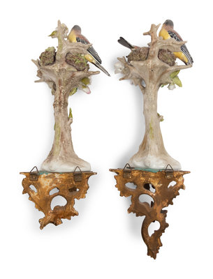 A Pair of Sitzendorf Porcelain Models of Birds with Giltwood Wall Brackets