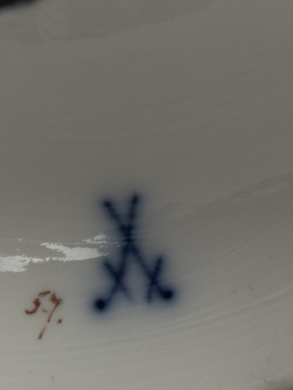 bearing crossed swords in underglaze blue, further incised L 107 and stamped 83 to the underside.