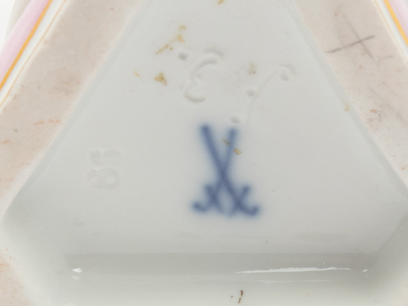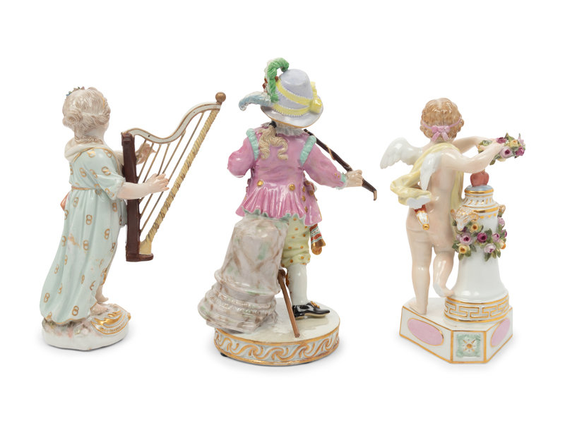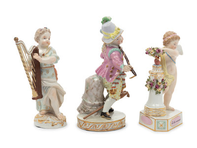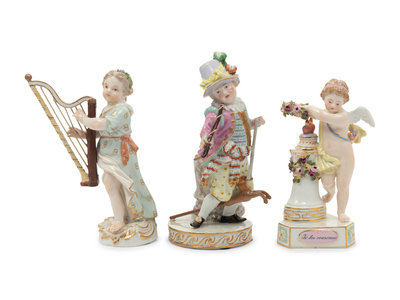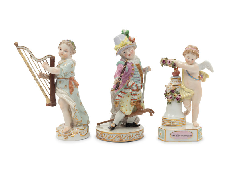 the figure holding an instrument incised 2550 and impressed 111; the example with a toy incised E 94 and 62 and inscribed with a W in iron red; the example titled Je les couronne incised F3 and impressed 88; each further marked with crossed swords in underglaze blue to the underside.