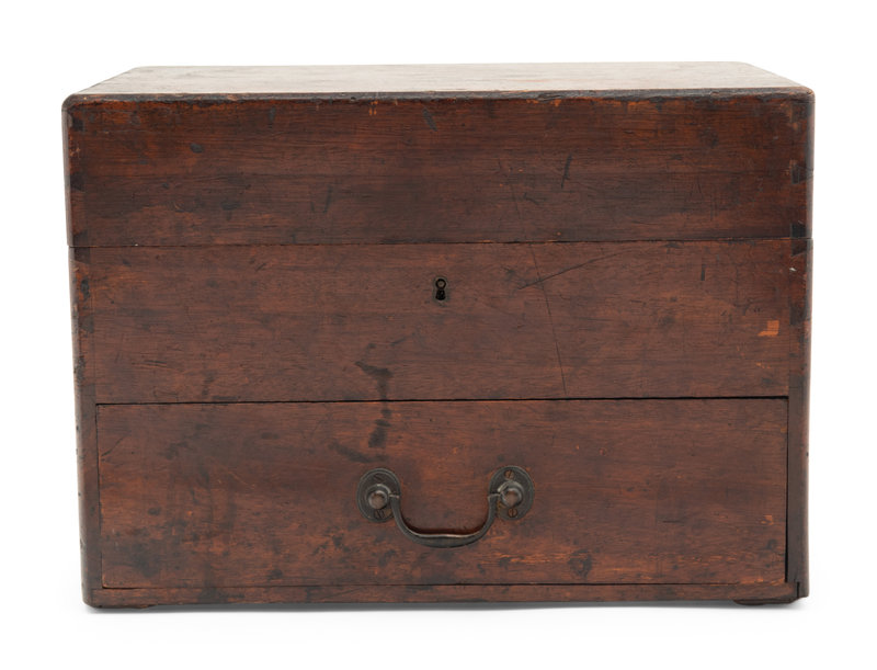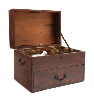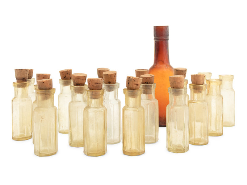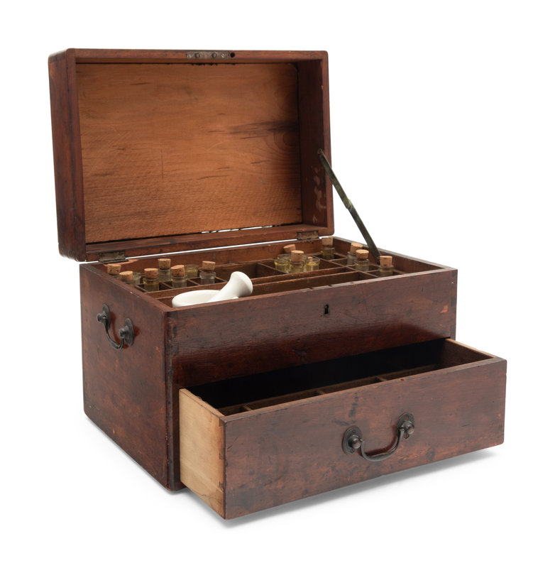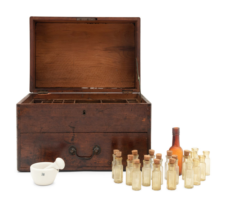 opening to a fitted interior with twenty glass bottles and a ceramic mortar and pestle.
