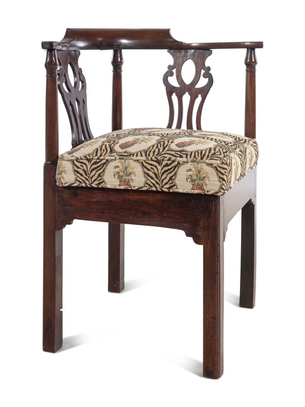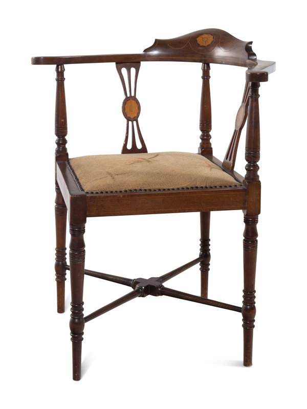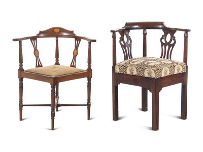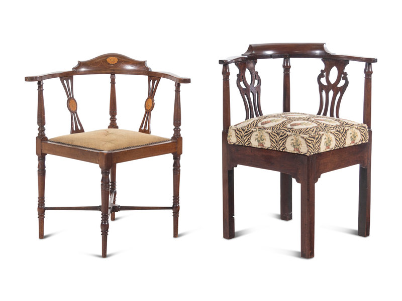 An Edwardian Boxwood-Strung Mahogany Corner Chair and a Similar Mahogany Corner Chair