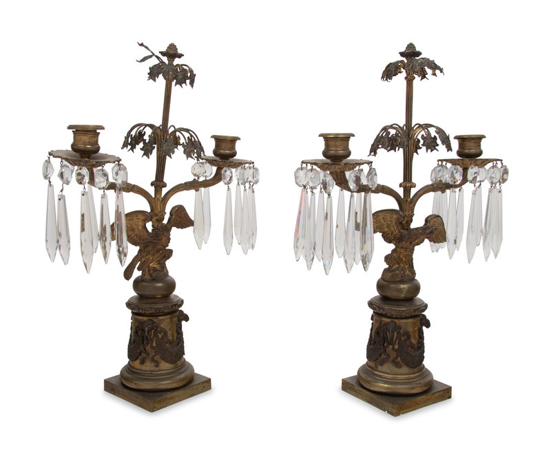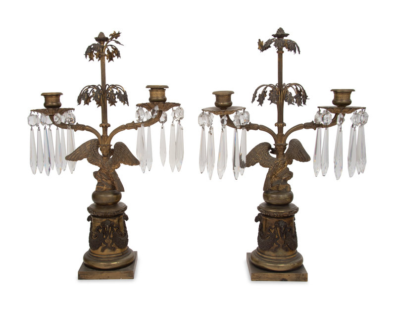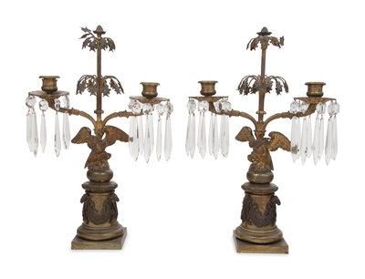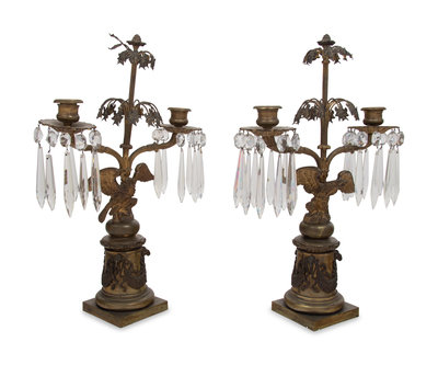 A Pair of English Gilt Metal and Glass Two-Light Candelabra