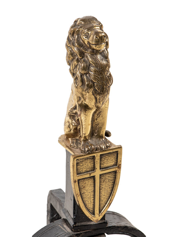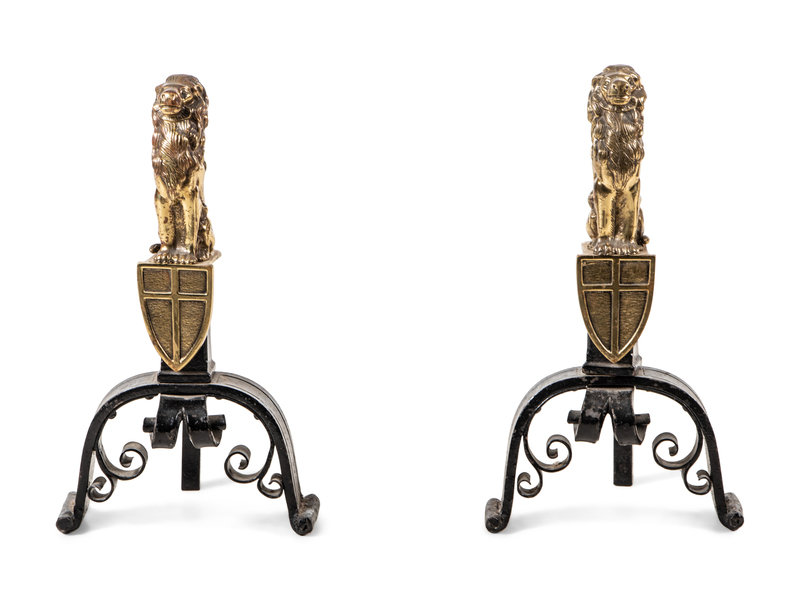 A Pair of English Gilt Brass and Black Painted Iron Andirons with Lion Finials