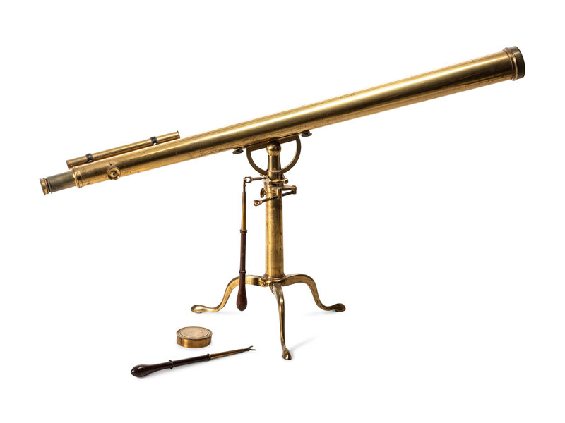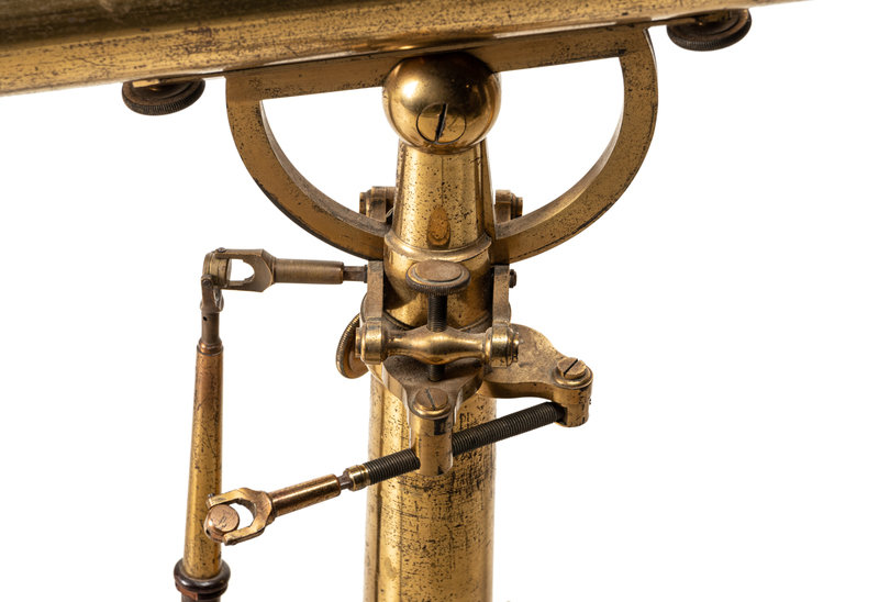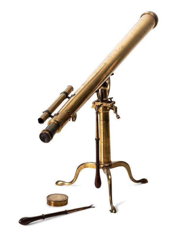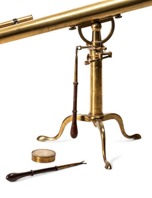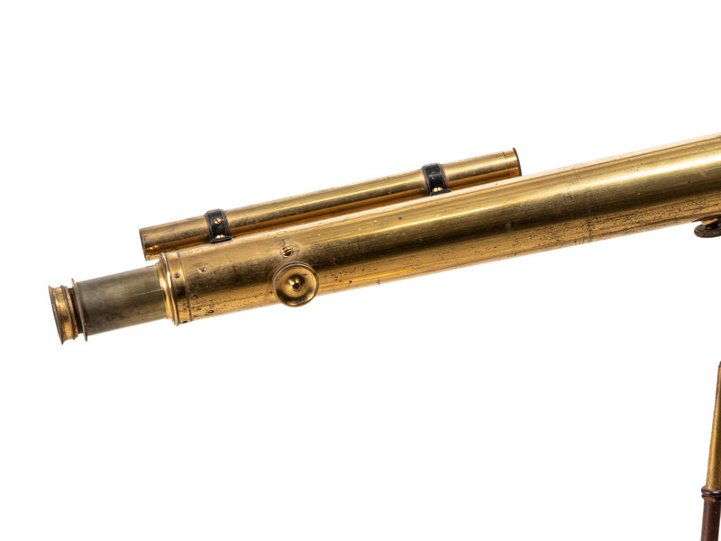 with finder (lacking eyepiece), rack-and-pinon focusing and rod-operated azimuth adjustment on a folding tripod stand with cabriole legs.