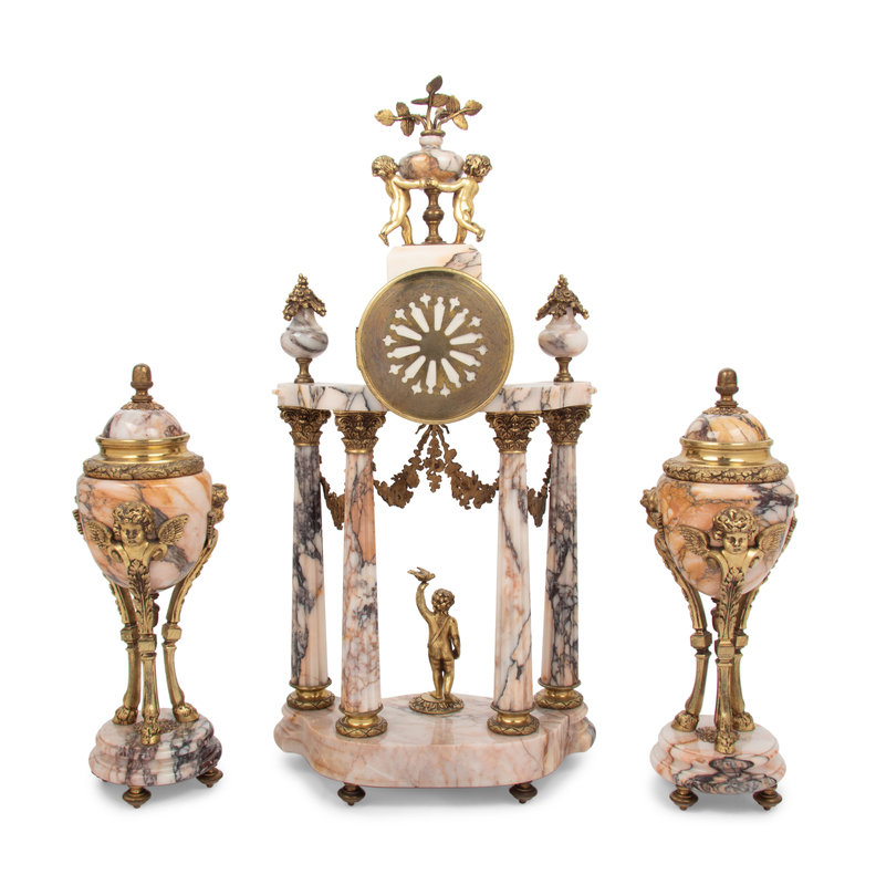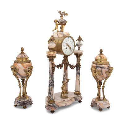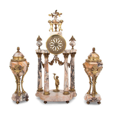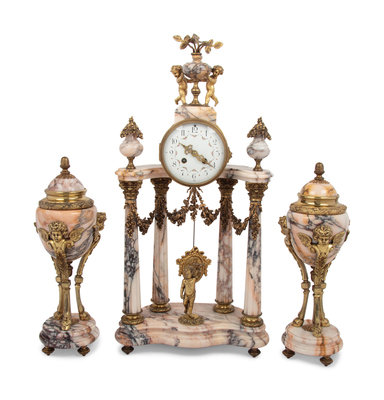 A Louis XVI Style Gilt Metal Mounted Marble Clock Garniture