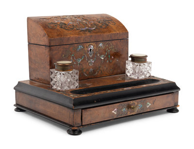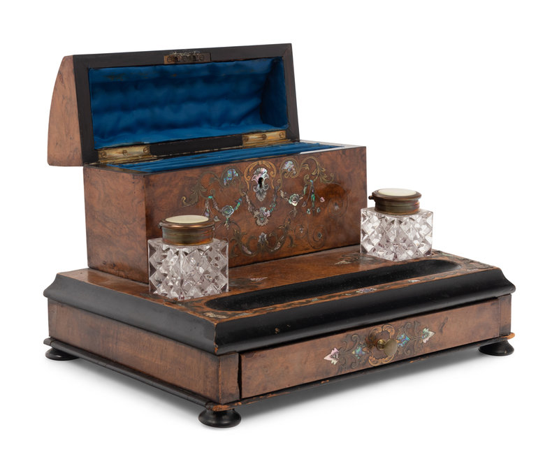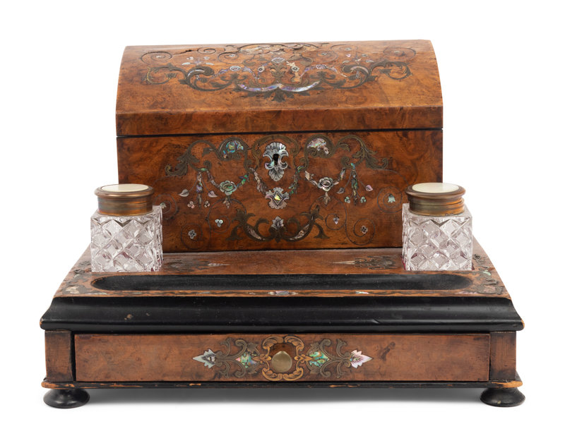 A Napoleon III Burlwood Marquetry and Mother-of-Pearl Inlaid Ink Stand
