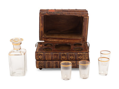 A French Musical Faux Book-Form Decanter Set