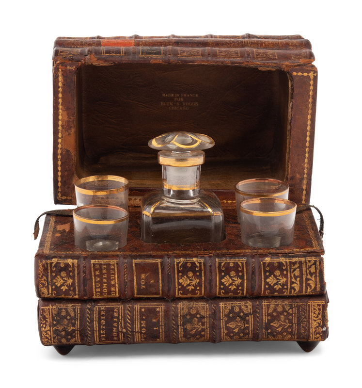 the case fitted with four glass tumblers and a decanter, the underside of the case lid stamped Made in France/ For/ Blum's Vogue/ Chicago.