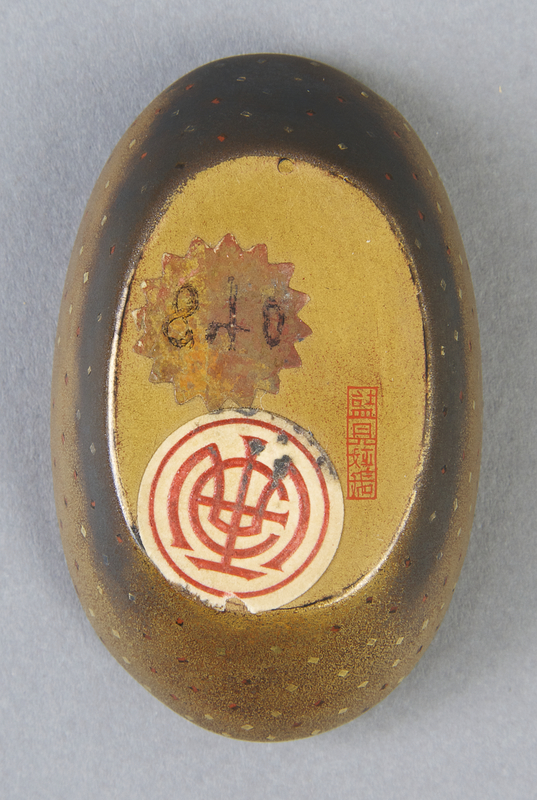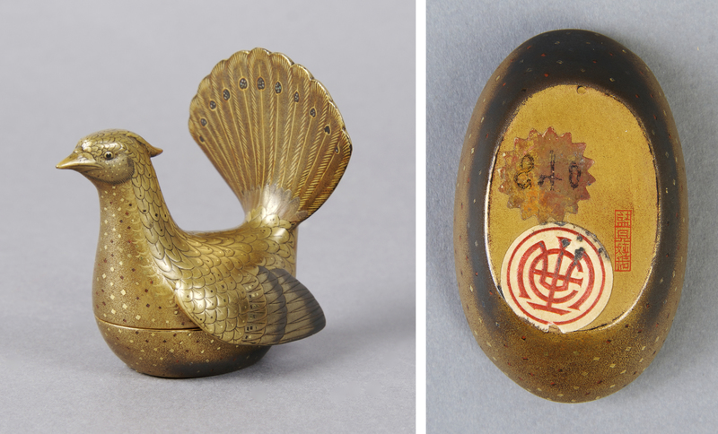 depicting the bird with flared tail feathers having mother-of-pearl inlay, opening to an egg form center, bearing a signature in red on the underside with applied labels.