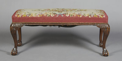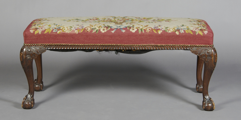the rectangular seat with floral needlepoint upholstery, raised on carved cabriole legs ending in claw and ball feet.