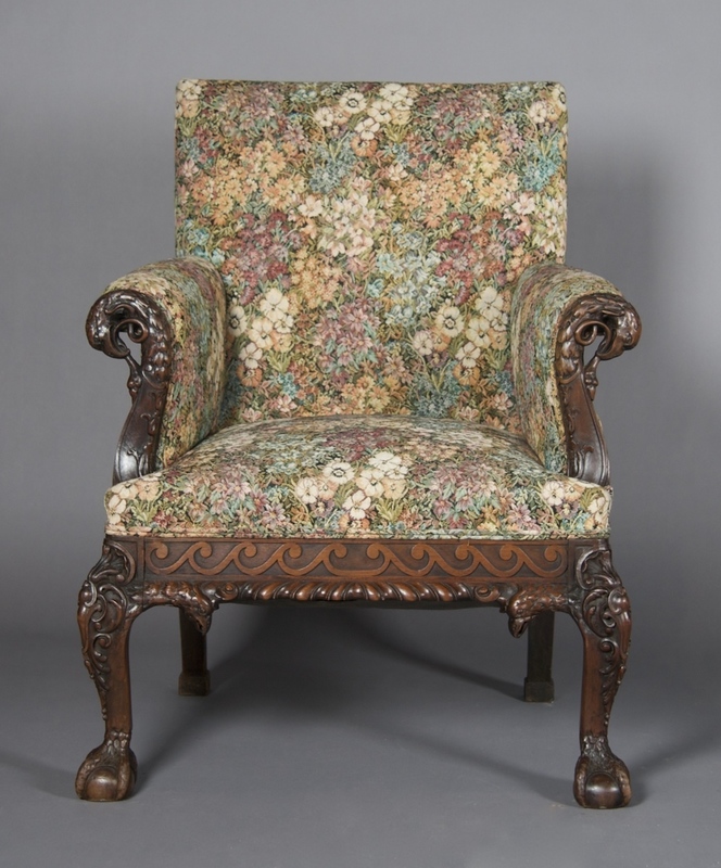 having upholstered back and seat with carved eagles on the hand holds, with band of carved wave decoration on rail above eagles' heads, raised on foliate carved legs terminating in claw and ball feet.