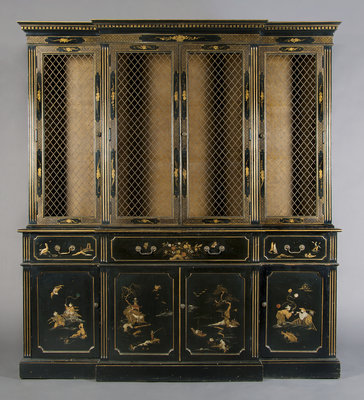 having four grill inset doors over a secretary drawer flanked by drawers over four paneled doors, with Chinoiserie decoration throughout.
