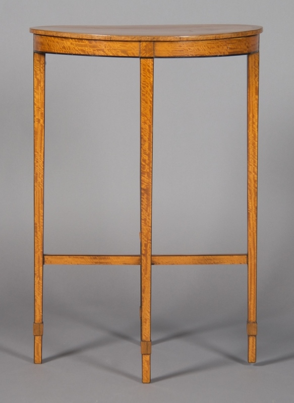 the oval banded top above a plain frieze raised on square tapering legs joined by stretchers centered with a finial, having ebony stringing throughout.