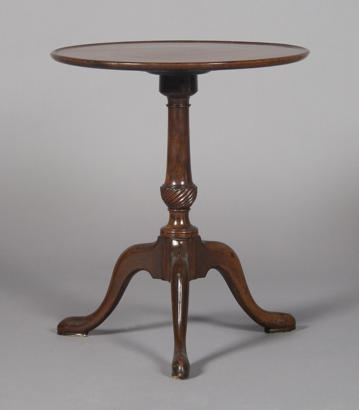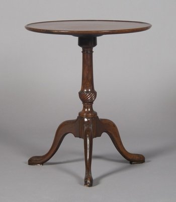 having a circular dished top over a turned and carved standard, raised on three shaped legs.