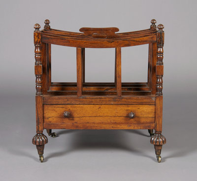 the upper section with four compartments centered with a handle over a single drawer, raised on shaped feet over casters.
