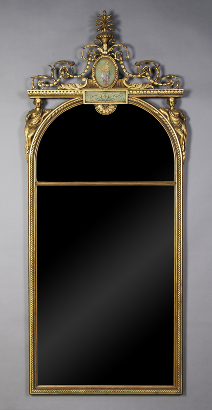 having scrolling foliate swags at top amongst two painted panels containing figural scenes.
