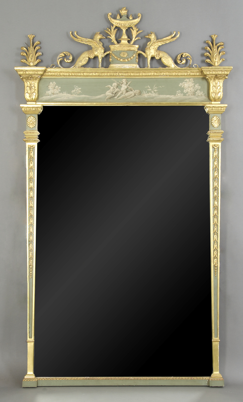 the rectangular plate surmounted with an urn finial flanked by griffins,over a panel painted with three putti.