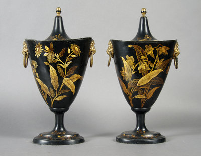 A Pair of Regency Tole Painted Chestnut Urns,