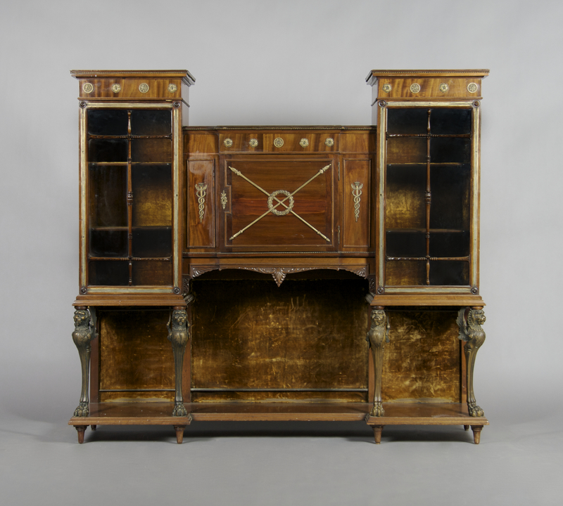 in the form of two glazed columns joined by a central cabinet all raised on monoped griffin supports over a medial shelf set with Neoclassical brass mounts throughout.